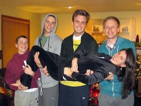 We got new sweats on Christmas Eve. This position was a horrible idea because (A) it's totally unflattering but more importantly (B) the boys loved jabbing and tickling me as Mom was taking the picture. You can tell by the picture Logan is up to no good!