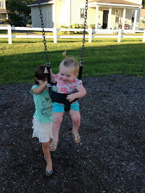 Every night this summer at about 6 pm Josh would be on the subway heading home from work and I would be at the park with Bryn and Mya. Josh was having a lot of fun in NYC, but I think I might have had the better end of the deal because he missed out on some pretty cute moments with these two sweet girls! It's my very favorite thing to watch these two play and laugh together. Sometimes just watching them play makes my heart want to burst! Cheesy, but true! Bryn loves to push Mya on the swing and she takes her job quite seriously, but Mya just laughs and laughs the whole time.